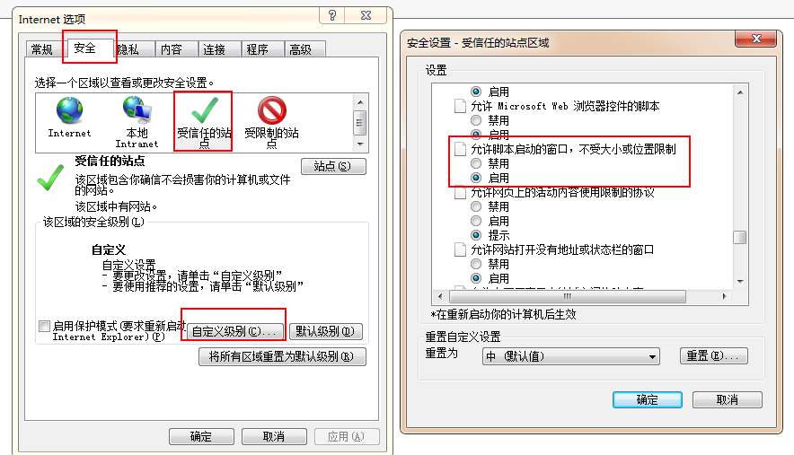 特別提醒:添加好了,設置自定義級別,找到[允許腳本啟動窗口,不受大小或位置限制]將啟用,建議(將所有項啟用),如下圖。