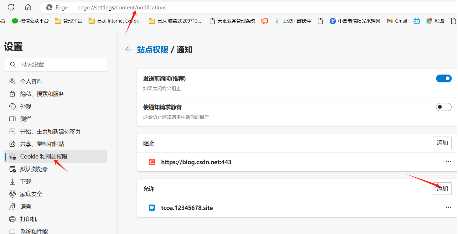 第一步:在地址欄輸入edge://settings/content/notifications,然后點”Cookie和網站權限/通知/允許/添加網址”,如下圖